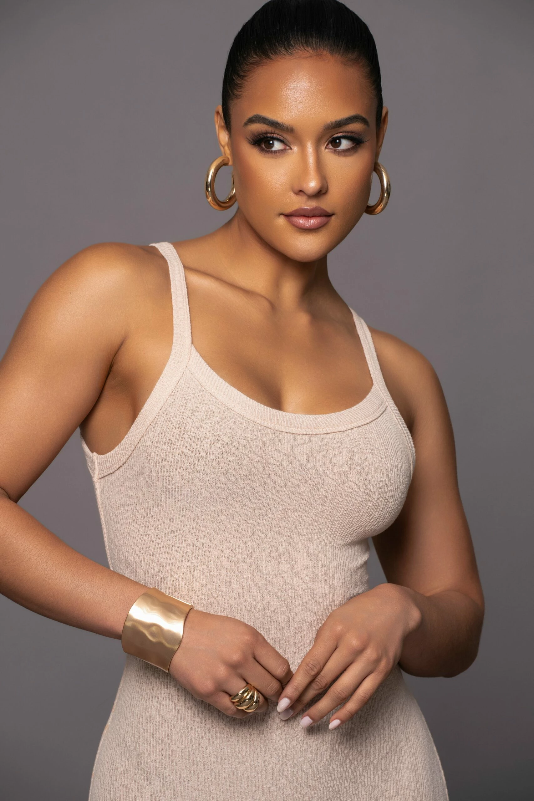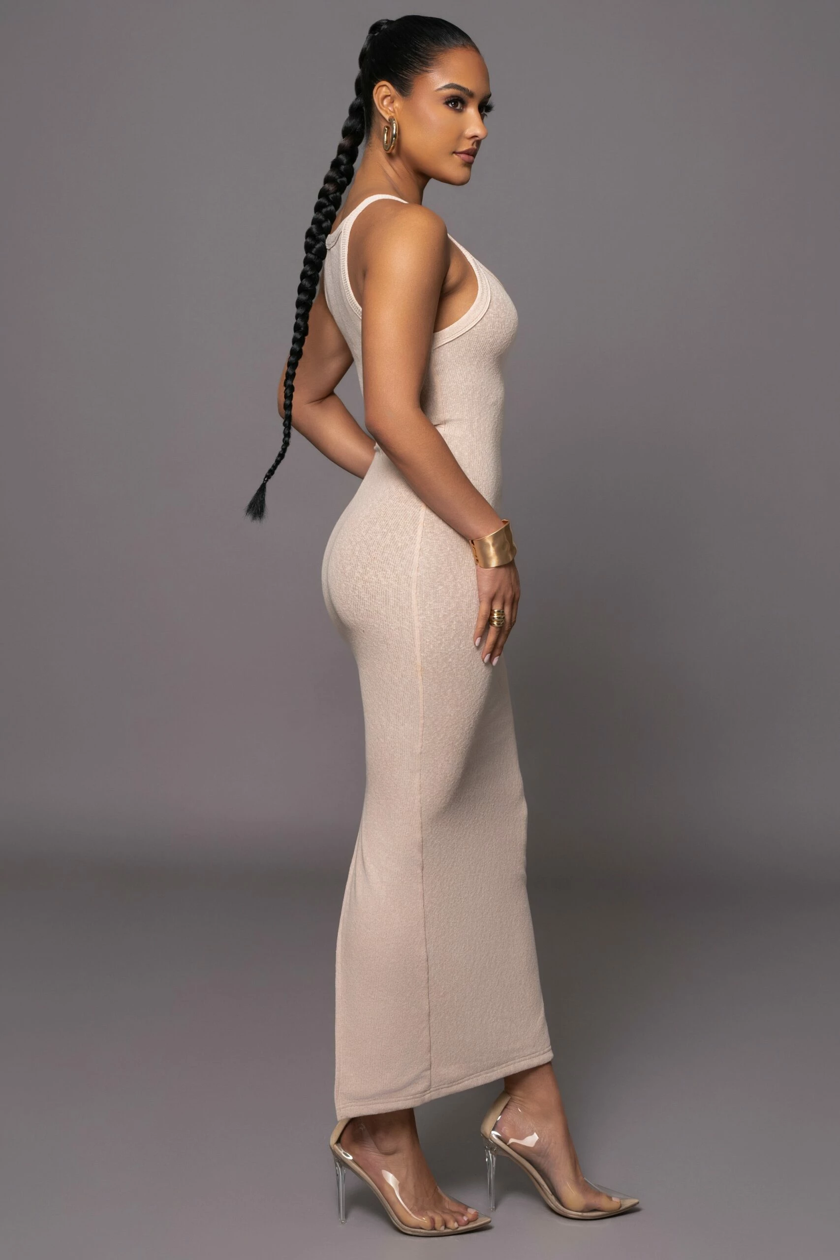 Our new Tan Back To You Maxi Dress is a sleek and sophisticated garment that combines comfort and style. Featuring a U-neckline with fixed shoulder straps, back seam detail, and a maxi hem. A form-fitting silhouette accentuates your curves, while nude interior lining adds a smooth finish. Back slit hem. Stretchy.