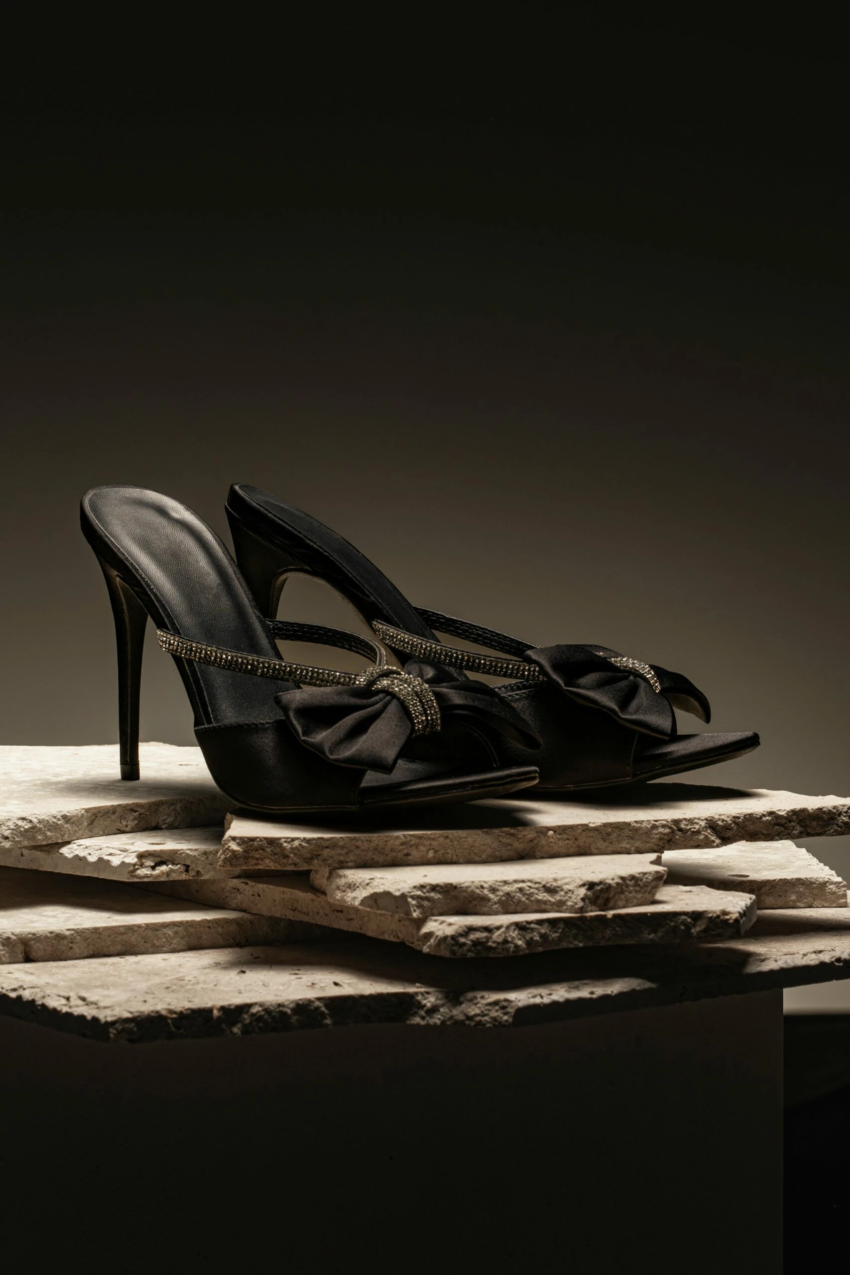 Match sparkle to your look with our Black Glimmer Of Sparkle Rhinestone Heels. Made in a high-shine satin fabric, these open point-toe heels feature a stunning center bow with dazzling embellished straps. Cushioned insole for comfort. Slide-on wear.