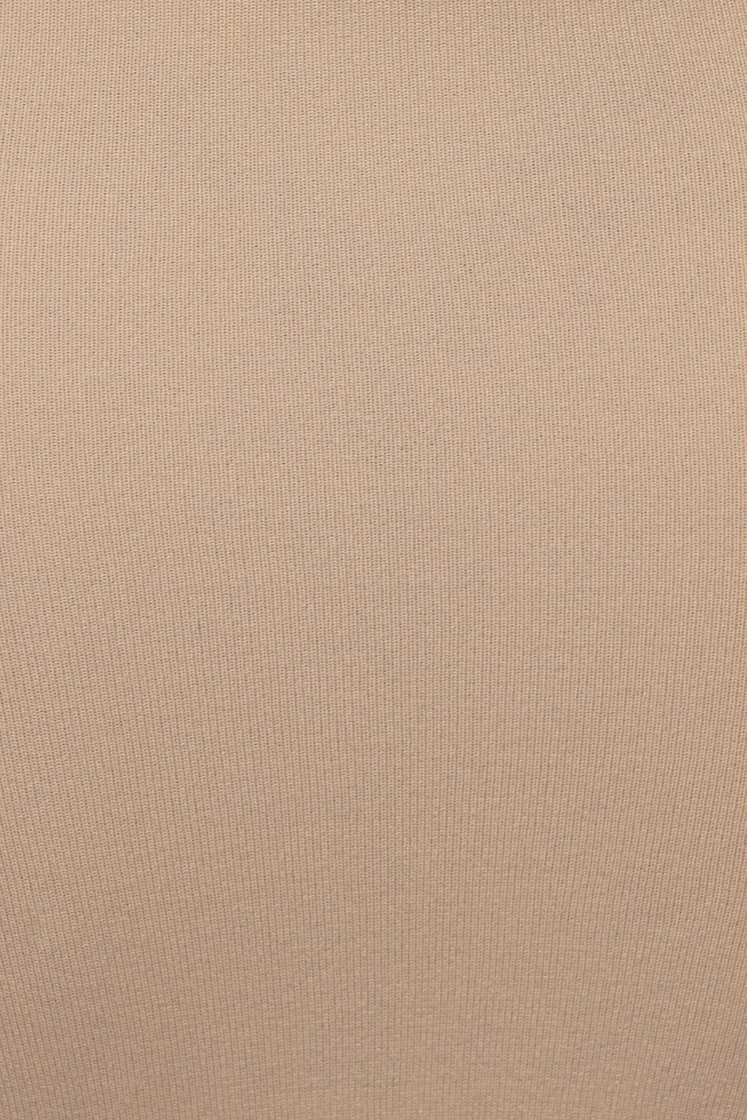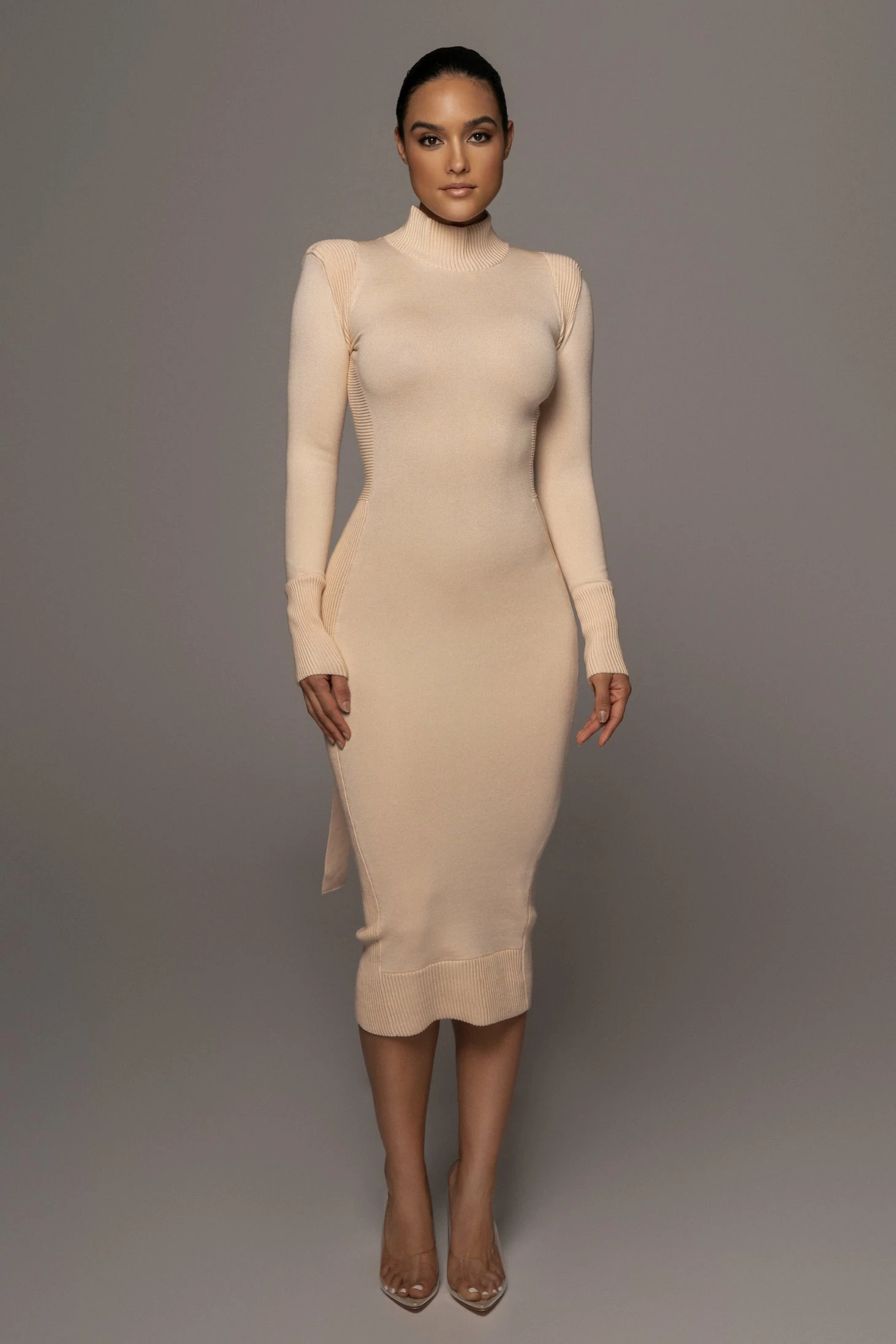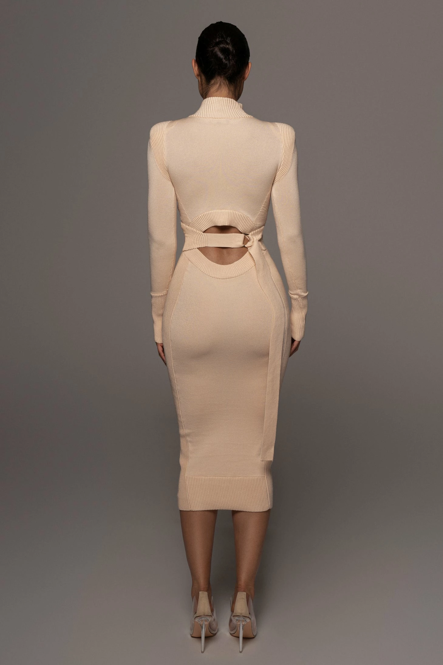 EXCLUSIVELY DESIGNED BY US FOR YOU. Fall for our latest showstopper the BUTTERCREAM UNDER YOUR SPELL DRESS. This classy midi dress features a mock neckline with long sleeve arms and flattering ribbed hems and sides for a modern touch. A stunning cut out back with a D-ring belt detail finishes the look. Padded shoulders. Stretchy.
