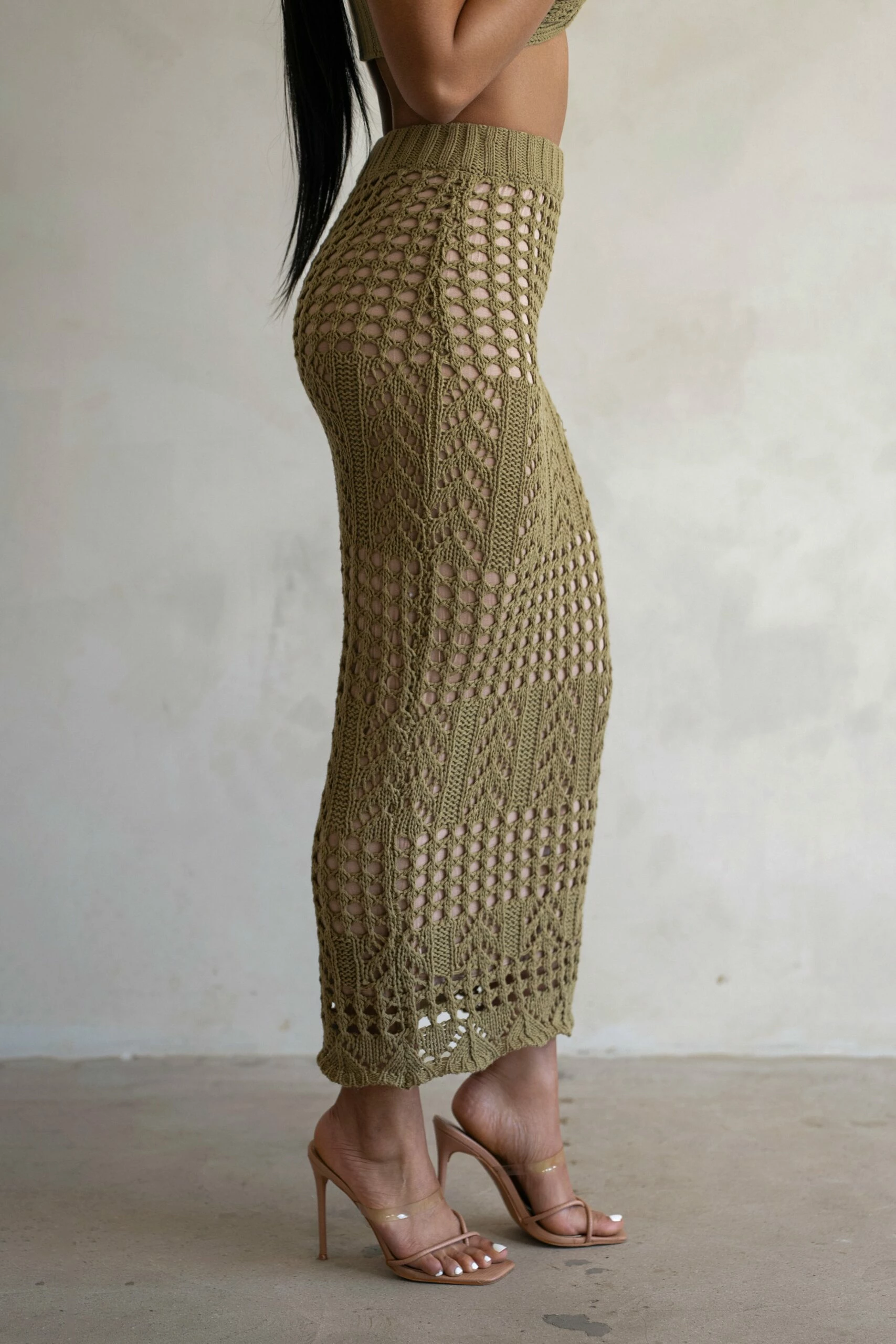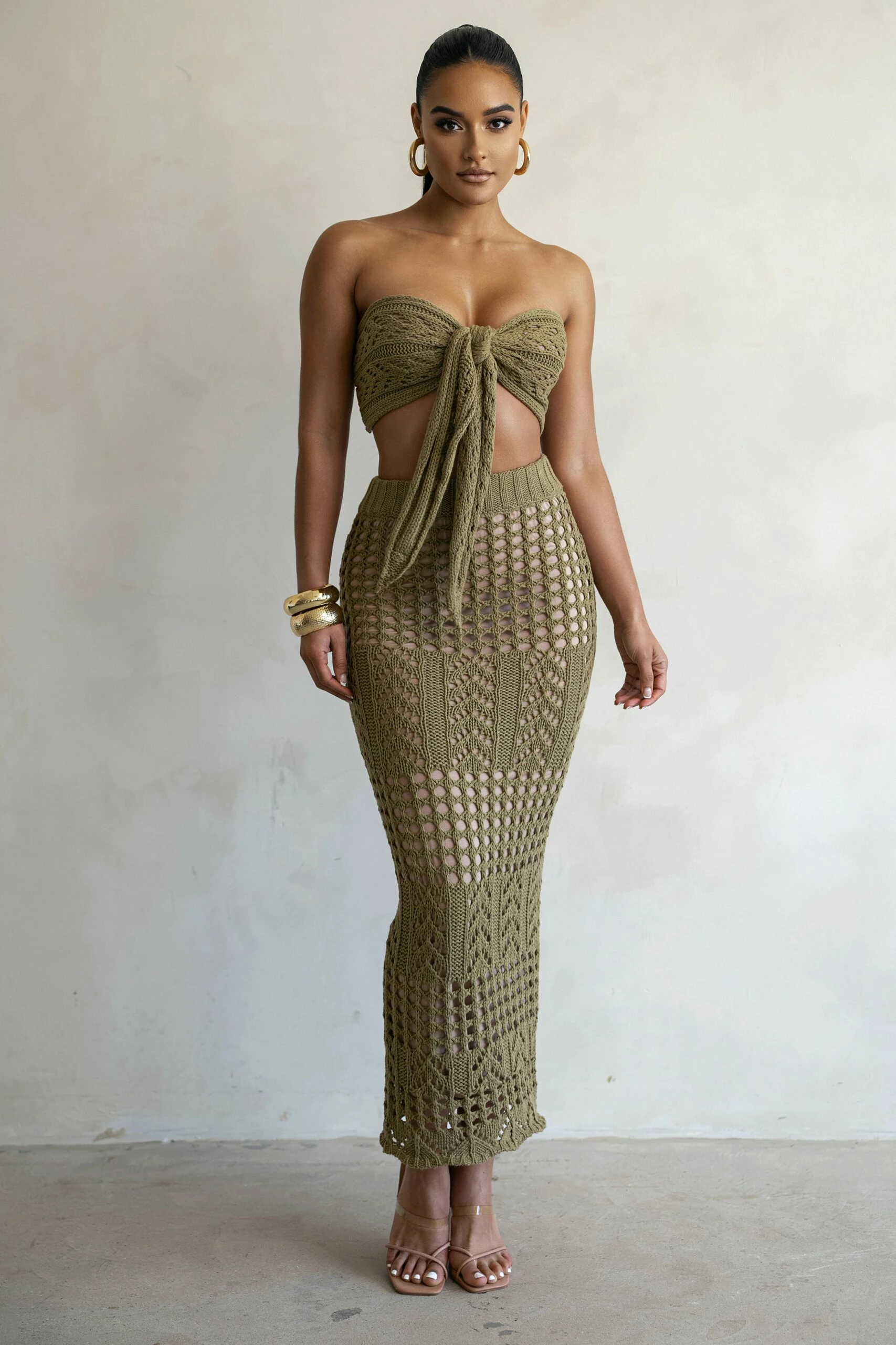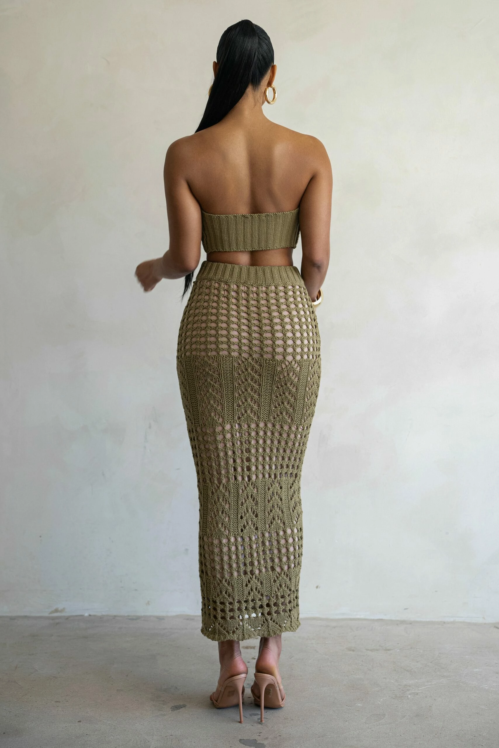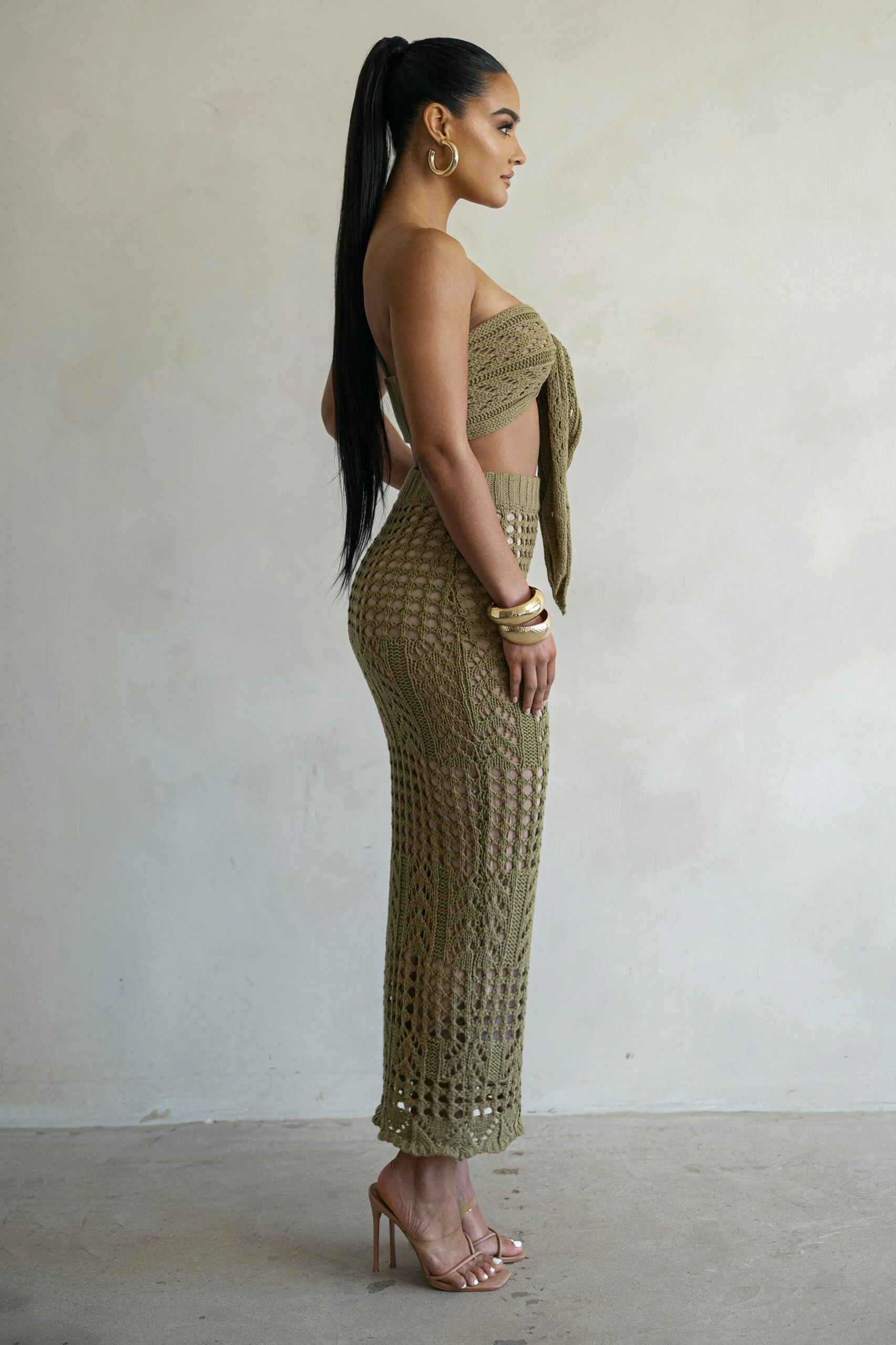 Embrace warmer days in the Olive Caribbean Skies Skirt Set. Crafted in a custom designed airy crochet material, our newest skirt set features a sweet crochet bandeau style top with tie front design and interior lining for coverage. The matching skirt features a pencil silhouette with scallop trim hem and nude interior lining for coverage. Elastic band. Stretchy. Sold as set. Double Lined.Â