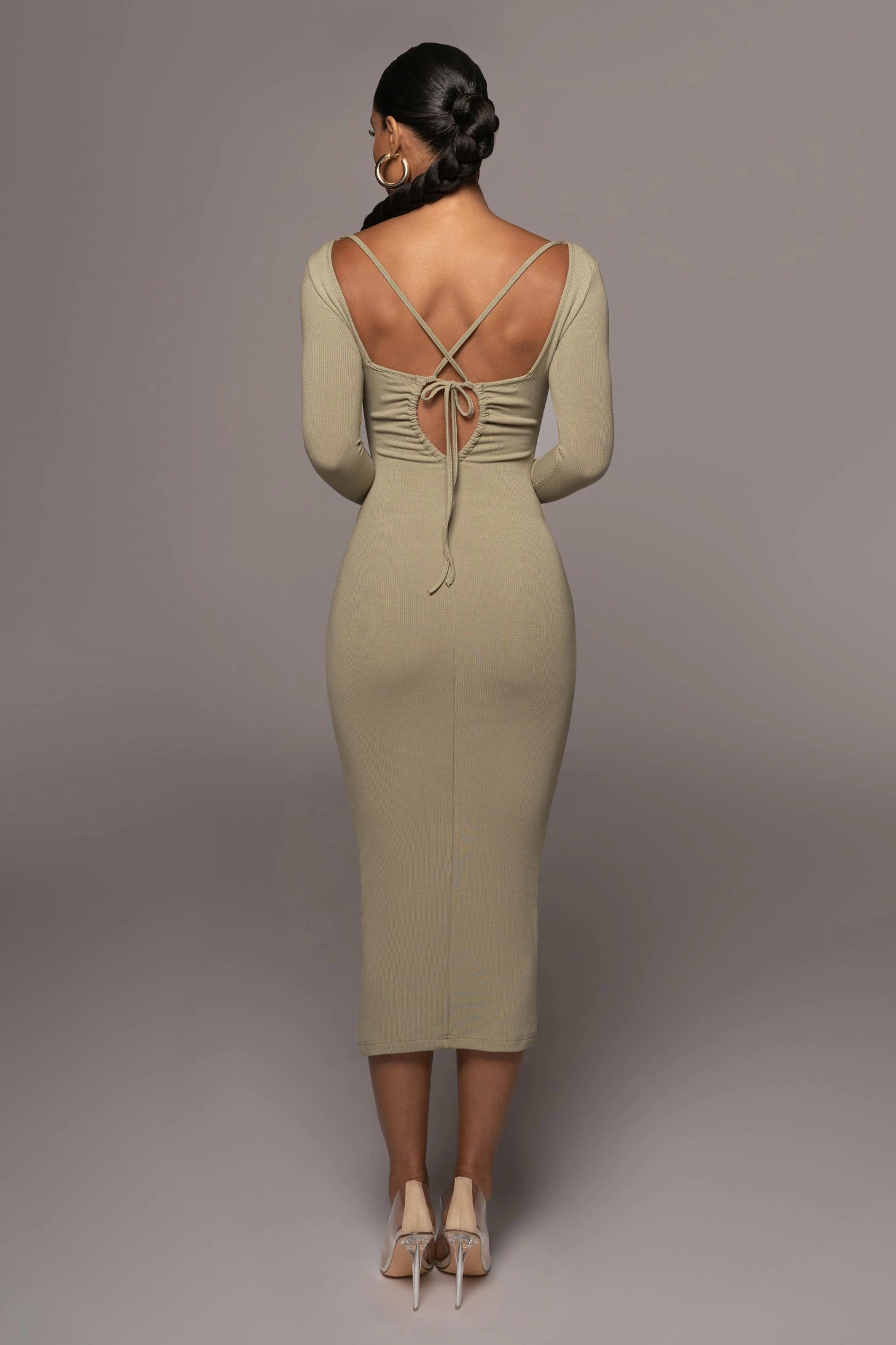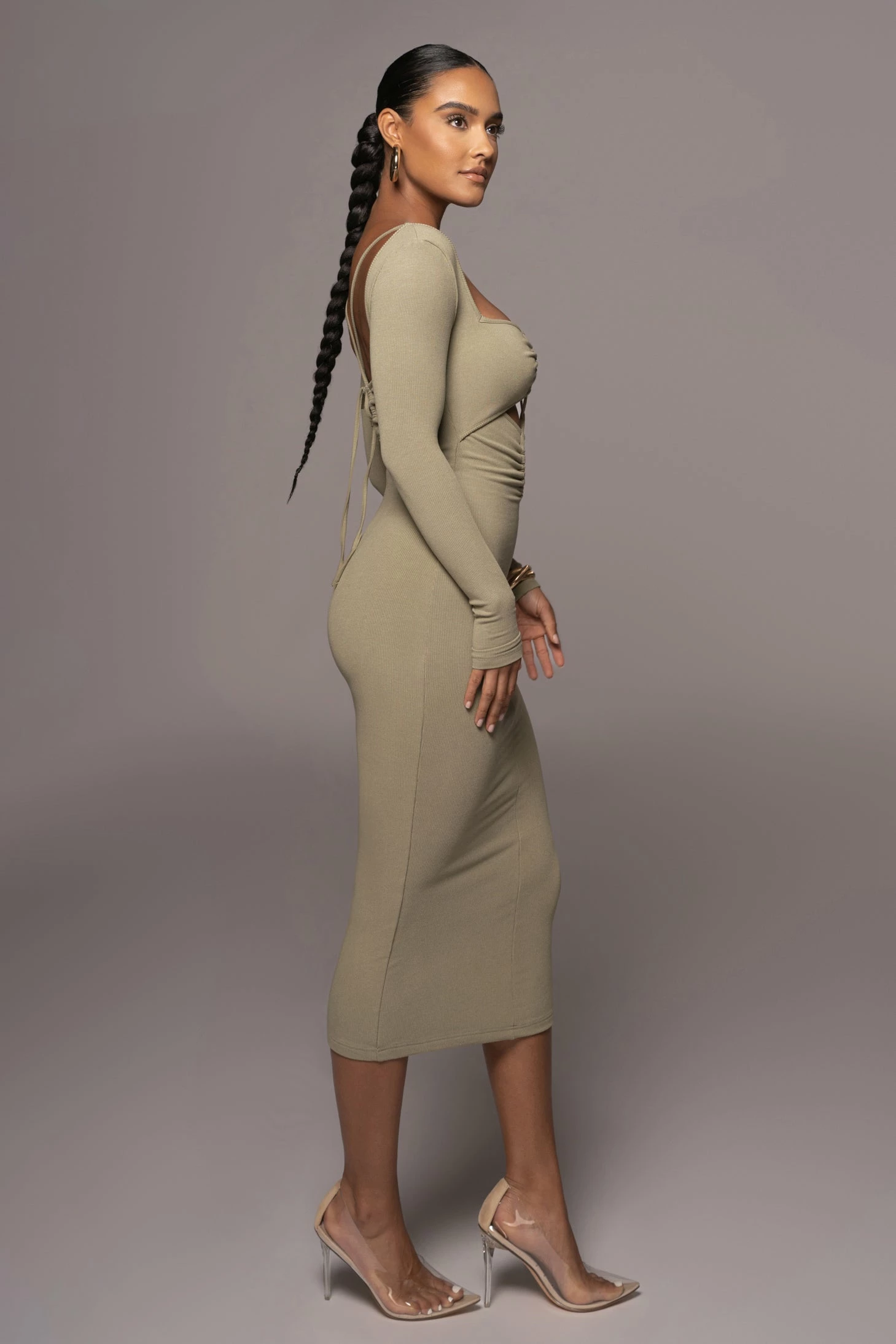 Cut to perfection in our new Olive Mesmerize Midi Dress. Dress to stun in this ribbed long sleeve dress featuring a bold cutout with crisscross design and adjustable back ties that connect at the back for a stylish finish. Double lined. Stretchy.