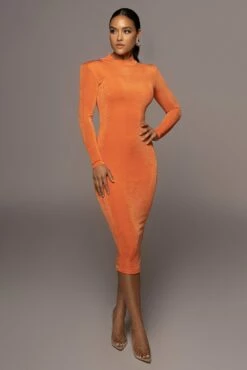 EXCLUSIVELY DESIGNED BY US FOR YOU. Crafted in our signature slinky fabric, the ORANGE AUDETTE TURTLENECK DRESS is classic and perfect for any occasion! Featuring a mock neck with long sleeves and a flattering, bodycon silhouette ending in a midi length hem. Complete with shoulder pads for just the right amount of sophistication. Stretchy. Slip on style.
