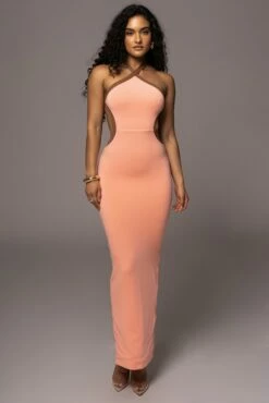 Step into summer elegance with our Peach Nights In Milan Midi Dress! Featured in a fitted silhouette, this exquisite maxi dress comes with a halter neckline and details a captivating contrast trim of mesh starting from the top hem down to the side waist. Stylish cutouts at the side and a back slit hem finish the look. Back zipper closure. Double lined. Stretchy.