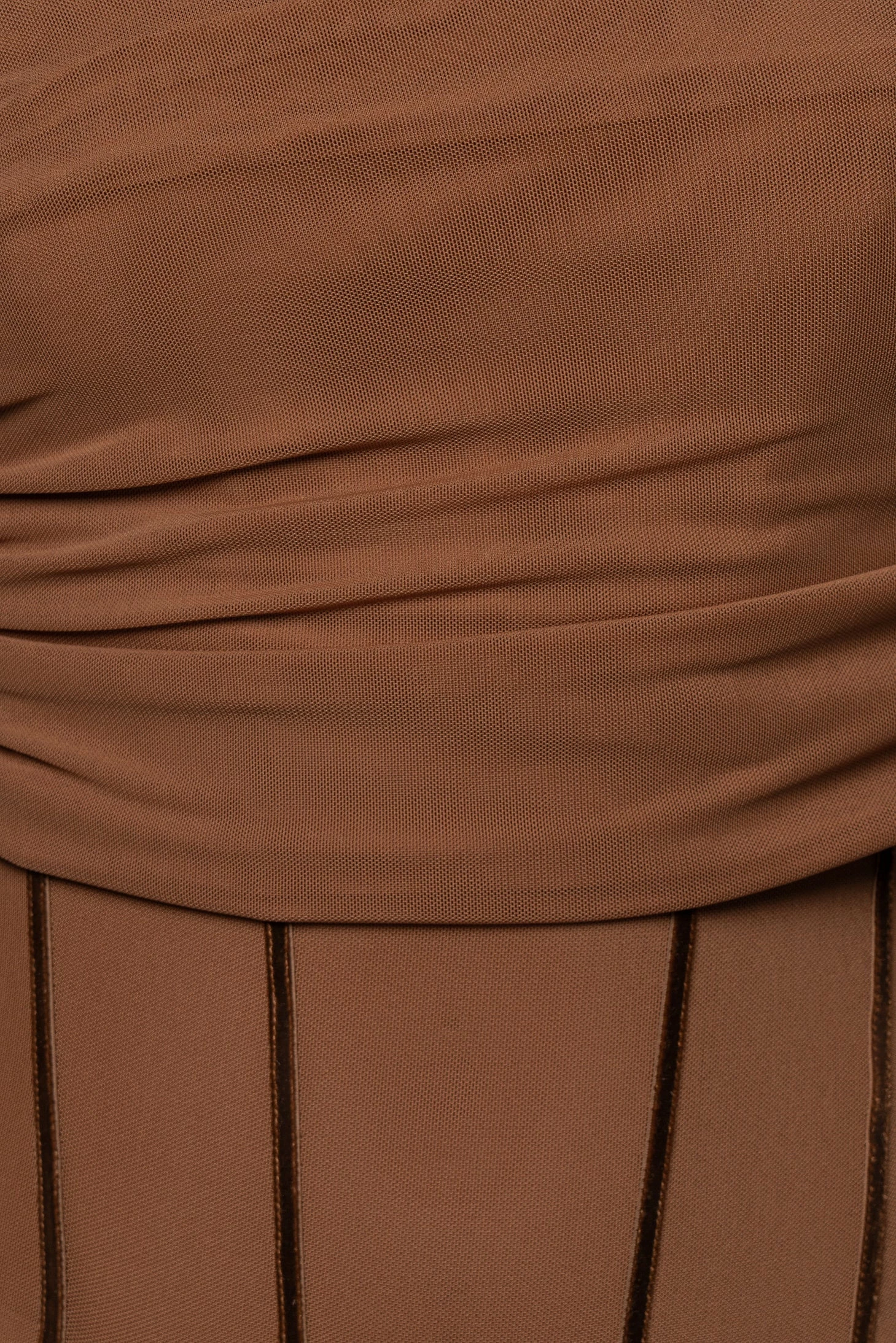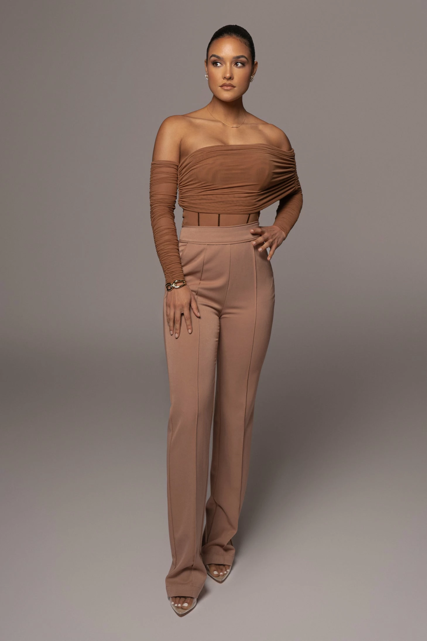 EXCLUSIVELY DESIGNED BY US FOR YOU. Our PECAN SHEER PERFECTION BODYSUIT is just that! Crafted in a sheer mesh fabric, this elegant bodysuit showcases an asymmetrical neckline with exaggerated an off shoulder design, ruched arms and bust, and stunning boning trim detail at the waist in a soft velvet fabric. The lower waist of this bodysuit is composed of a smooth doubled lined material for comfort. Complete with a thong bottom and double snap closure. Stretchy. Single lined.