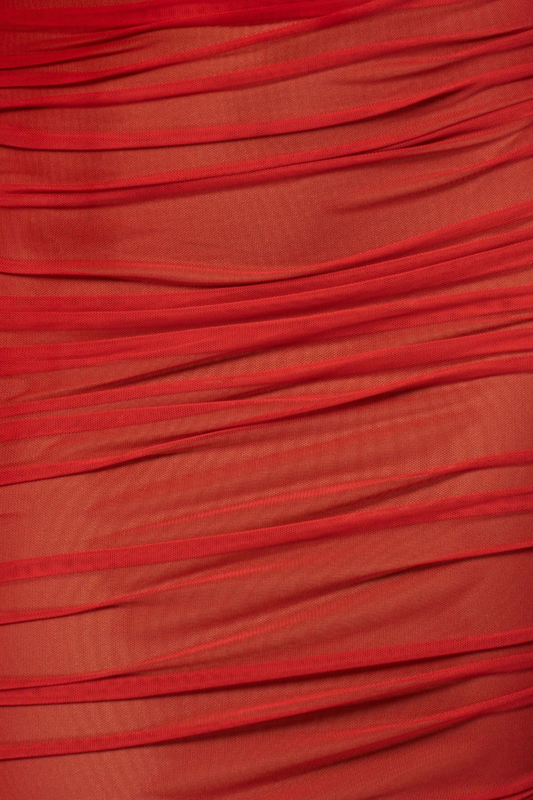 Our Red Denise Ruched Dress is mesh perfection! This modern midi dress features a one shoulder neckline with full arm coverage, a padded bust, and beautiful ruching detail throughout. A curve-hugging silhouette and stylish back slit finish the look! Complete with nude interior lining. Stretchy.