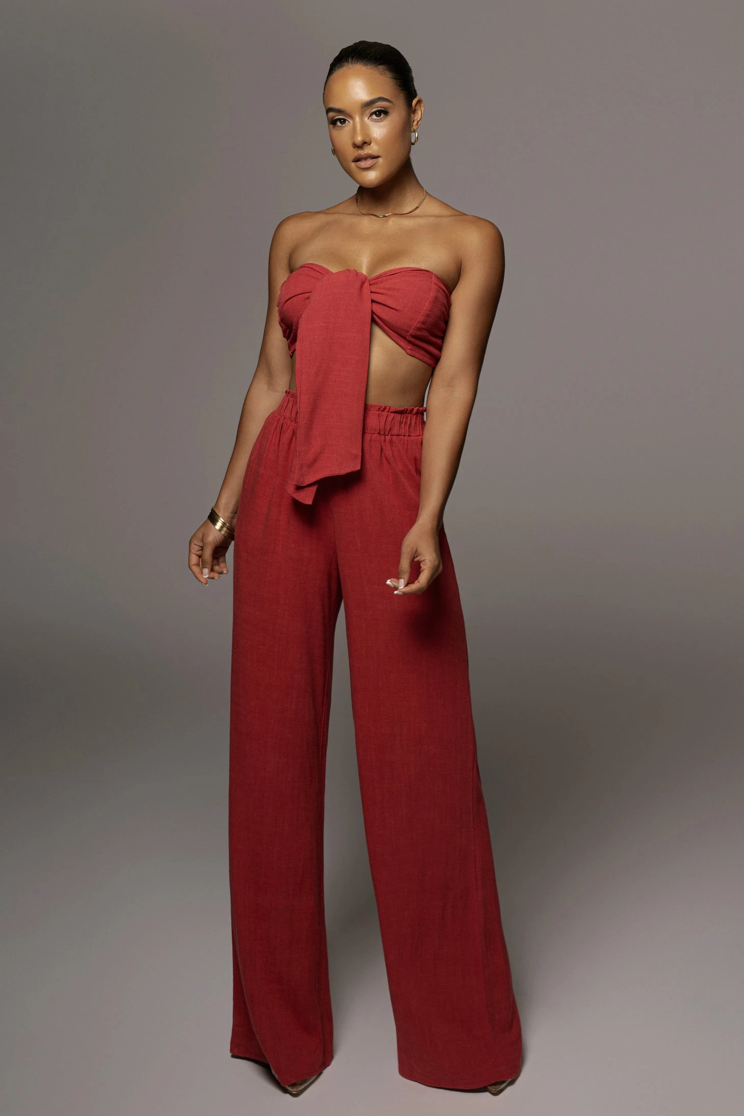 EXCLUSIVELY DESIGNED BY US FOR YOU. Our RED MORE LOVE LINEN SET has taken over! If you love our Tory Two Piece Set, you’ll have more to love with our new design crafted in stretchy linen for a flexible and comfy feel. Featuring an alluring bralette top with an adjustable front tie and a smocked elastic back. The matching pants to this two piece set are topped with a high elastic waistband, wide leg hems, and functional side pockets. Both pieces are so easy to mix and match you’ll find yourself reaching for them on repeat. Stretchy. Sold as set.