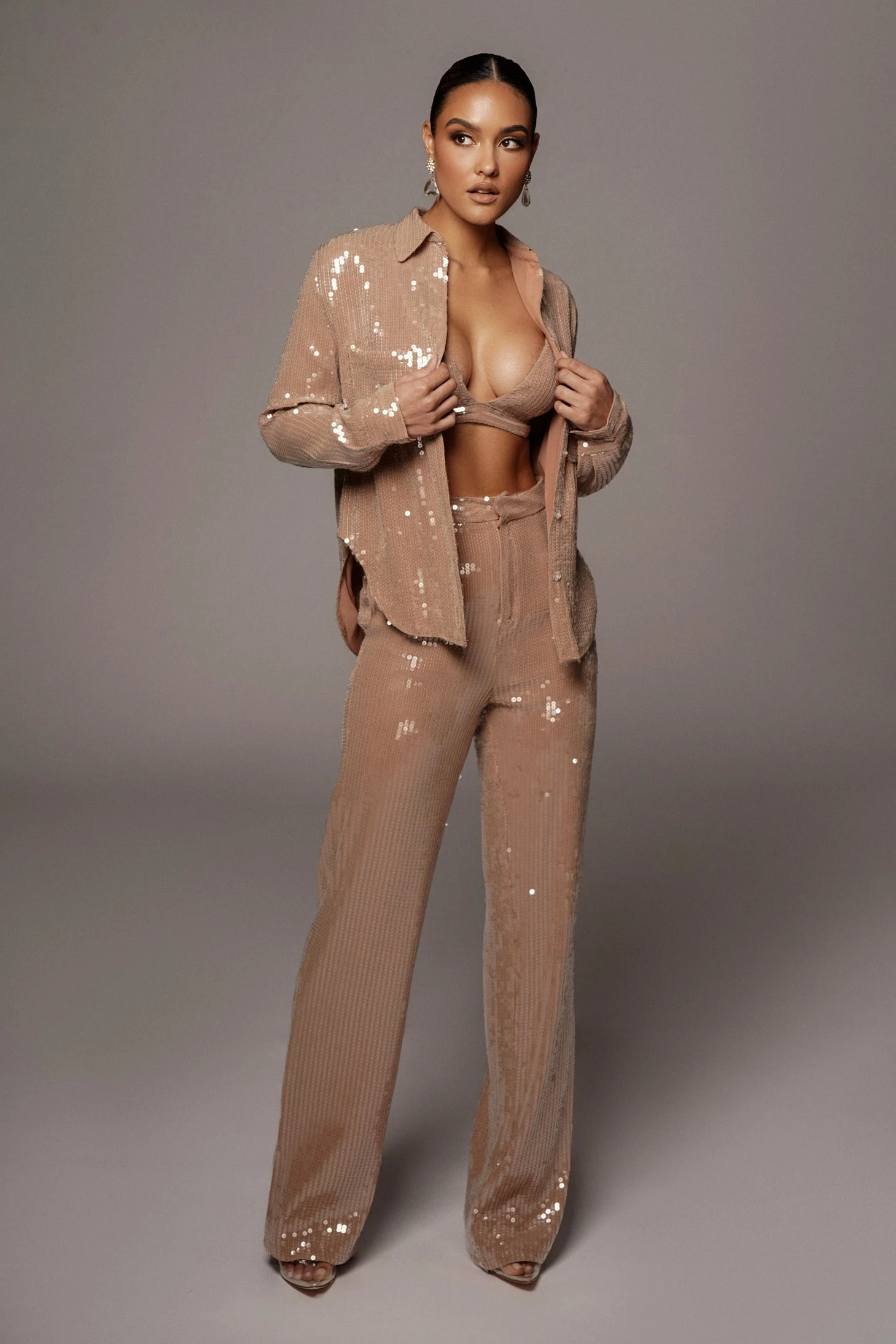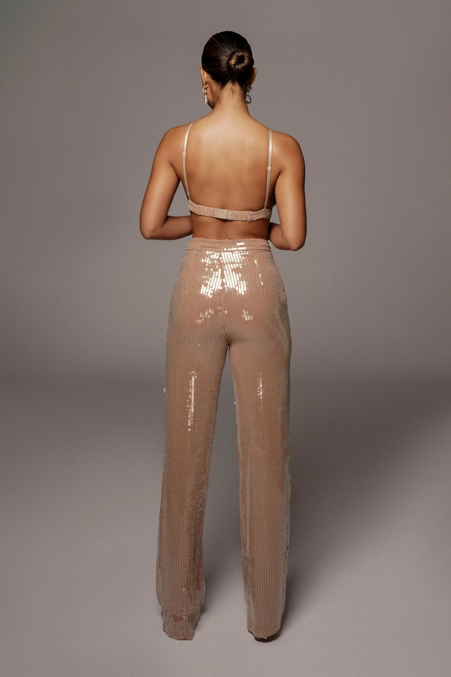 The glamour never stops when it comes to our Tan Elowen Sequin Trousers! These beautiful straight leg trousers are featured in sequin fabric with a high waist, inseam pockets, and a front zipper with clasp closure. Tan chiffon interior lining adds a soft touch. Pair with the