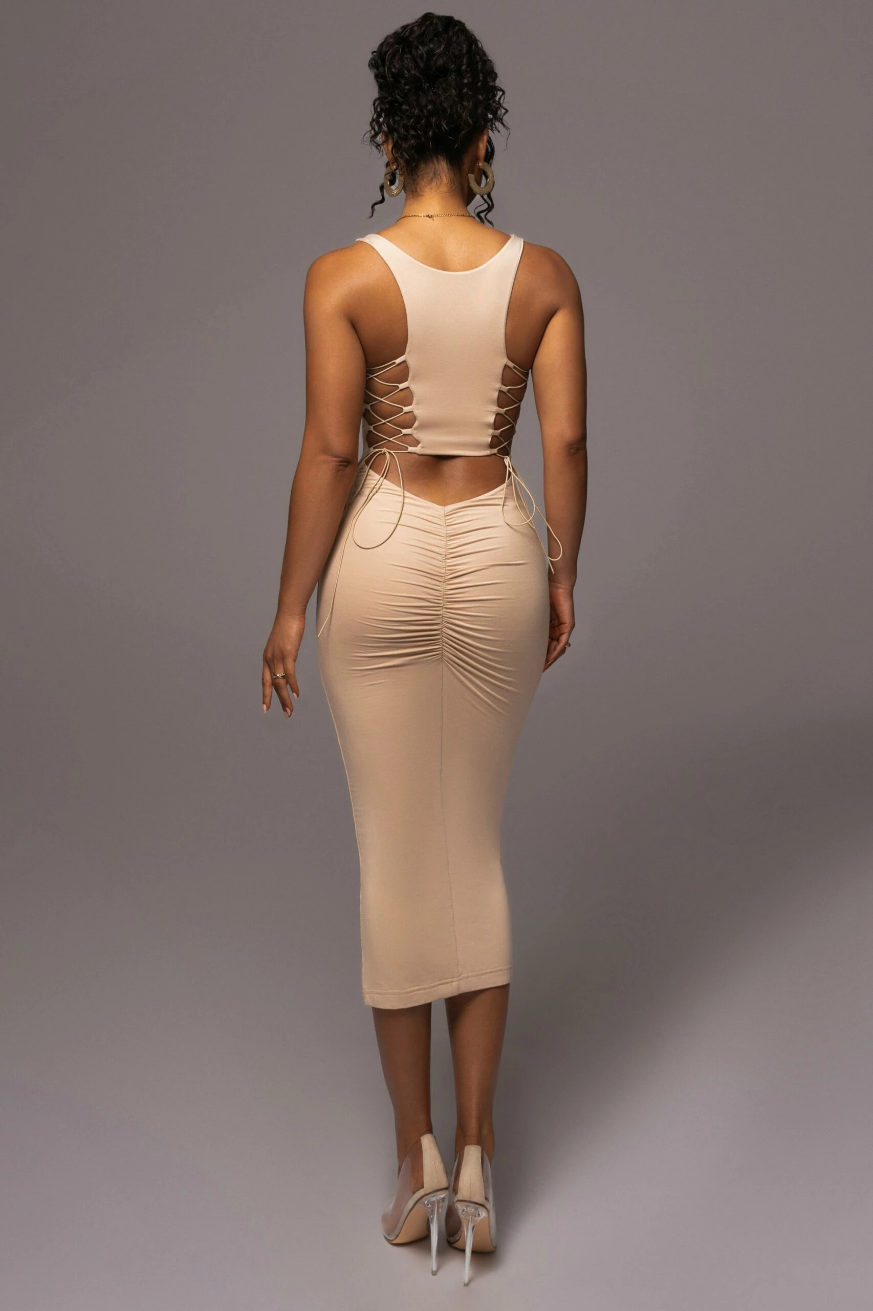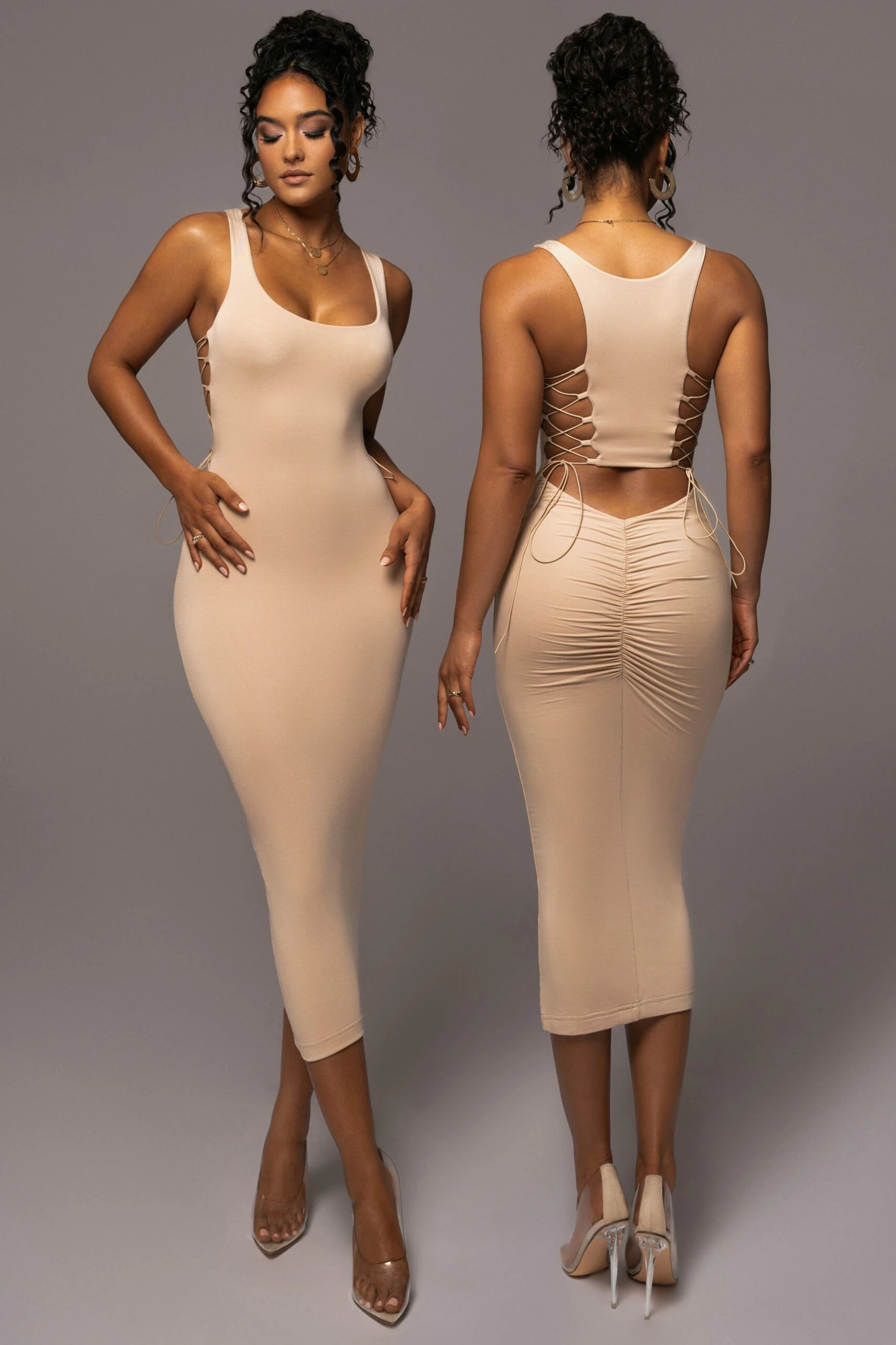 Embrace the summer season with confidence in our Tan Late Nights Midi Dress. Crafted from our signature double lined fabric, this fitted midi dress showcases a scoop neckline with a racerback cut and stylish lace ups bungee strings. Stretchy.