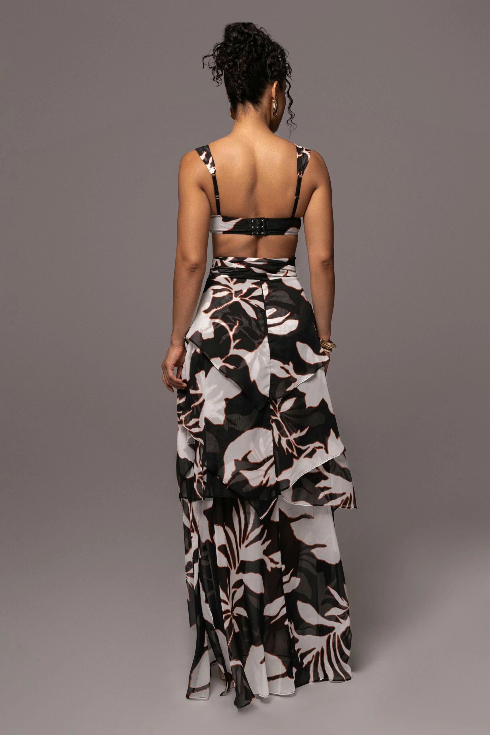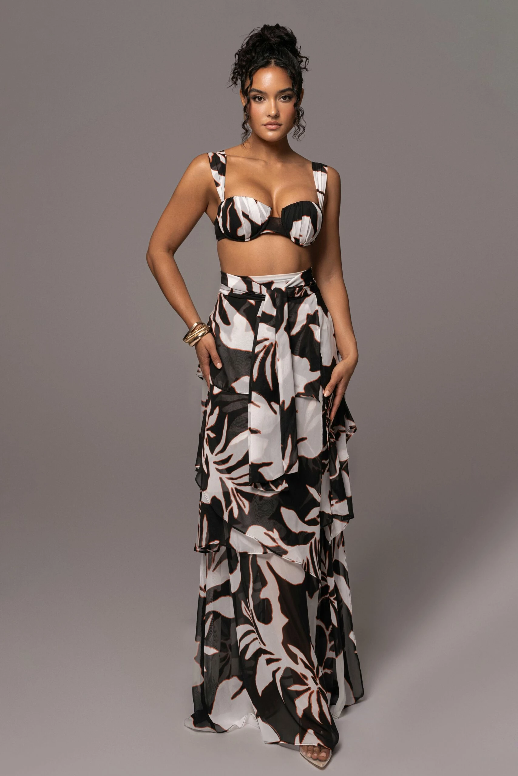 Our White Floral Printed Love Two-Piece Set sets a romantic tone all summer in a lovely floral pattern. Featuring a pleated bra top with padded cups, adjustable shoulder straps, and hook and eye closures. The matching skirt features a tie waistband and ruffled tiers cascading down to the maxi hem. Crafted in breathable chiffon material keeping your style on a fresh note all season. Single lined. Sold as set. Minimal stretch.